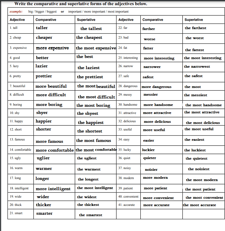 | Adjectives | Comparative | Superlative | |